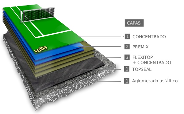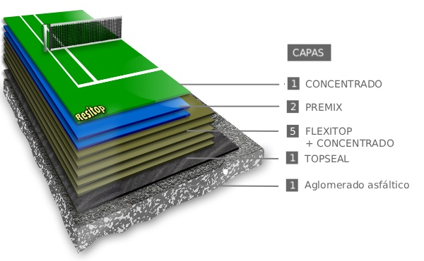 Revestimiento multicapa sobre base asfáltica para pistas de Tenis de alta competición y superficies deportivas multiuso en instalaciones elementales de colegios, ayuntamientos y clubs deportivos para la práctica de los deportes base como el baloncesto, balón mano, fútbol sala… tanto en interiores como al aire libre.