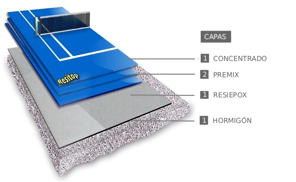 Revestimiento multicapa sobre hormigón para superficies deportivas multiuso en instalaciones elementales de colegios, ayuntamientos y clubs deportivos para la práctica de los deportes base como el tenis, baloncesto, balón mano, fútbol sala… tanto en interiores como al aire libre.