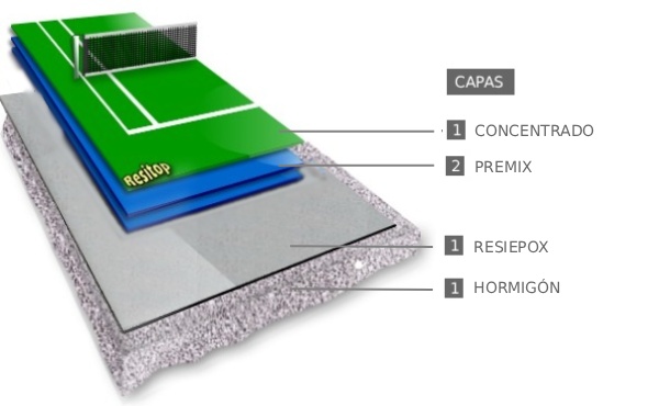 Revestimiento de 1 a 2 mm de espesor, continuo, en colores, impermeable, altamente resistente al desgaste y a la acción de los agentes atmosféricos en los climas más extremos, su micro rugosidad lo hace idóneo para una práctica deportiva segura tanto al aire libre como en interiores.